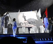 La pioggia non ha fermato Napoli e alla cerimonia inaugurale in piazza del Plebiscito, domenica sera, delle World Series America’s Cup, hanno partecipato oltre 15.000 persone. Uno spettacolo emozionante ideato da Marco Balich della Filmmaster events, con la sfilata dei 9 team internazionali. E’ stato il Presidente della Repubblica Giorgio Napolitano, con un videomessaggio proiettato sul “timpano” della Chiesa di San Francesco di Paola, a incitare le istituzioni ed i napoletani ad usare questo evento come trampolino di lancio per una nuova era. “Guardo alla capacità di Napoli di esprimere tutte le ricchezze e le potenzialità che possiede – ha dichiarato il Capo dello Stato – Non manchi la fiducia e il coraggio per aprire una stagione nuova”. Piazza del Plebiscito è stata trasformata in un gigantesco acquario con effetti di luce, proiezioni e trampolieri che impersonavano delle enormi meduse facendo da palcoscenico ad uno spettacolo che ha emozionato tutti. In apertura il reading di Peppe Servillo che ha celebrato il protagonista di questa prossima settimana: il mare, attraverso le parole della meravigliosa poesia “O’ Mare” di Edoardo de Filippo.