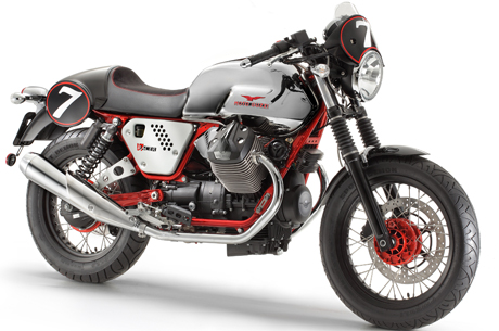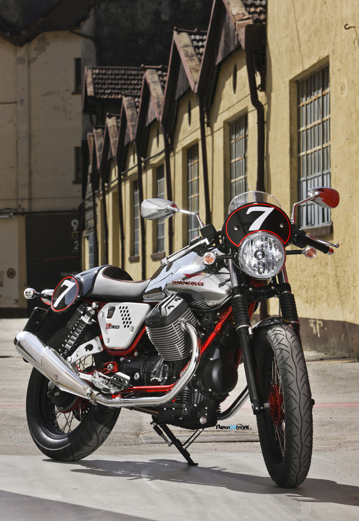 Su queste tubazioni appoggia la sportivissima sella monoposto (ma sono disponibili come accessori a richiesta la sella biposto e le pedane passeggero), rivestita di pelle scamosciata e raccordata in un codone aerodinamico sul quale sono state integrate lateralmente le tabelle porta numero, nel più puro stile seventies. Di scuola tipicamente Guzzista è il cupolino, la cui forma richiama, con il piccolo plexiglas sormontante la tabella porta numero, il leggendario frontale della Gambalunga, sportivissimo e intonato stilisticamente al nuovo design del parafango anteriore.