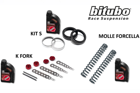 Bitubo realizza per la perfetta messa a punto di una forcella, una serie di prodotti specifici che permettono un’accurata personalizzazione dell’assetto in base alle proprie esigenze . Una forcella è composta da una serie di elementi che, in configurazione di serie, non esprimono al meglio il potenziale che questo strumento può imprimere alla moto: una pronta risposta delle molle, una tenuta perfetta dei paraoli ed un olio in grado di svolgere al meglio il proprio compito in qualunque condizione. Bitubo ha studiato una serie di kit in grado di permettere un rapido upgrade su qualunque forcella in commercio; si parte dal kit molle forcella (MKit), un prodotto destinato sia alle moto supersportive che a quelle stradali. MKit è composto da molle in acciaio legato (sia lineari che progressive) e da olio specifico studiato in collaborazione con Fuchs – Silkolene.