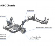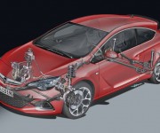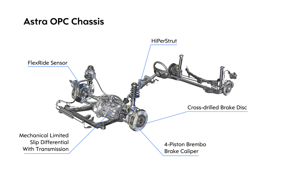 Per la nuova Astra OPC, Opel ha creato un telaio ad alte prestazioni particolarmente efficiente in termini di dinamica laterale e dotato di elevata maneggevolezza, che si affianca al potente motore da 206 kW/280 cv e 400 Nm. Numerosi elementi del telaio, che monta sospensioni ZF Sachs, sono decisivi per il miglioramento della dinamica di guida della vettura: sospensioni ad alte prestazioni (HiPerStruts) sull’asse anteriore, telaio meccatronico FlexRide, differenziale meccanico autobloccante e freni Brembo. Le prestazioni del telaio sono ulteriormente ottimizzate dai cerchi in lega da 19” offerti di serie con i pneumatici 245/40 ZR. Per trasformare la potenza della nuova Astra in trazione efficace, l’asse anteriore è dotato di differenziale meccanico autobloccante a dischi multipli. Se una delle ruote anteriori perde aderenza, i dischi multipli all’interno del differenziale operano come frizioni, trasferendo la coppia dove è presente maggior trazione. Questo effetto bloccante (massimo 50%) dipende dall’angolo delle rampe ricavate nei mozzi di ancoraggio e determina di conseguenza l’applicazione della pressione alla frizione a dischi multipli, in funzione della differenza di coppia. Minore l’angolo, più sensibile risulta il sistema.