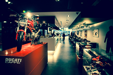 Questo prestigioso locale offrirà non soltanto il meglio in fatto di ristorazione e caffetteria italiana, ma anche abbigliamento e merchandising Ducati, creando così un mix esclusivo di cucina sofisticata ed eccellenza tecnica, il tutto alimentato dalla passione che anima la nuova partnership tra Ducati e AD Group. Visti gli ingredienti, il Ducati Caffè di Dubai promette di essere un’esperienza di successo che già prevede di ospitare numerosi eventi all’insegna della miglior tradizione italiana. Il nuovo locale, che occupa una superficie di 410 m2 distribuiti su due piani, è arredato con opere di “Ducati Art” e monitor LCD che visualizzano in maniera continua immagini di lifestyle Ducati. Alla parete è fissata una Superbike Ducati che aggiunge un tocco molto speciale, ricordando in ogni istante ai commensali la gloriosa tradizione della casa bolognese, costruttrice di meravigliose moto artigianali.