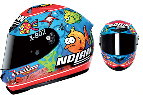 Per l’occasione, Marco ha deciso di personalizzareCa il suo Nolan X-802 con una livrea speciale e simpatica, realizzata in collaborazione con Max Design: pesci di vari colori e specie, per richiamare l’estate e la passione di Marco per il mare. Il casco si trasforma in un fondale marino. Pinne, maschera e boccaglio persino per il riccio portafortuna!