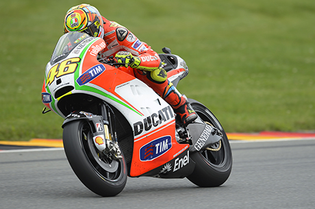 Valentino Rossi e Nicky Hayden hanno tagliato il traguardo del Gran Premio di Germania rispettivamente in sesta e decima posizione, dopo aver lottato per tutta la gara in un gruppetto di quattro, cinque piloti. Con un unico turno di prove, oltre al warm-up, senza pioggia, il Ducati Team ha avuto poco tempo per lavorare sugli assetti da asciutto che ha utilizzato oggi nel GP di Germania ma ha individuato una serie di regolazioni che hanno permesso ad entrambi i suoi piloti di girare con costanza su un buon passo.“Oggi in gara è andata un pochino meglio. In questo week-end abbiamo deciso di lavorare su un setting simile a quello di Barcellona ed Estoril, per “soffrire” meno con la gomma posteriore e, anche se abbiamo potuto provarlo poco sull’asciutto, si è dimostrato abbastanza efficace. Mi ha permesso di tenere un passo costante e discretamente veloce fino alla fine. Il distacco dalle Honda è tanto ma le Yamaha oggi erano più vicine. Quando mi sono reso conto che comunque non avevo il passo per andare via dal gruppetto in cui ero, ho aspettato il momento giusto per attaccare e alla fine sono riuscito a superarli quasi tutti. Quando ho provato con Bradl, e gli ero già quasi a fianco, ci hanno dato bandiera gialla per la caduta di Stoner e ho desistito perché avrei comunque dovuto lasciarlo ripassare. Ho fatto sesto, quest’anno il miglior risultato sull’asciutto, quindi adesso continueremo in questa direzione. La moto è un po’ più difficile da guidare ma almeno riesco a “staccare” forte e ad andare con un buon passo fino alla fine”.