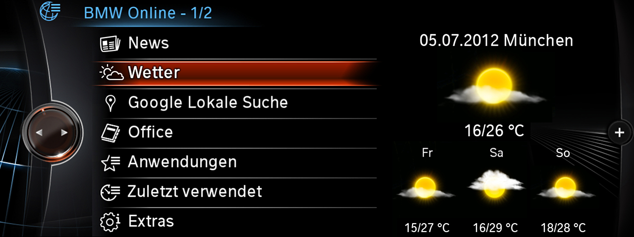Oltre alle funzioni online adesso è possibile visualizzare sullo splitscreen anche dei cosiddetti “widget”. I widget sono delle piccole rappresentazioni delle applicazioni di browser di BMW Online ottimizzate per lo splitscreen che si integrano perfettamente nella rappresentazione ad alta definizione degli altri elementi. All’inizio verranno introdotti un orologio e il widget Panoramio. In un secondo tempo seguiranno altri widget.