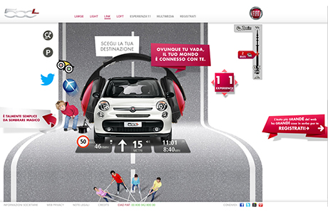 Sulla home page, alle spalle della 500L che accoglie i visitatori, si snoda una strada lungo la quale vengono fornite numerose informazioni sulla vettura, con persone e oggetti che si animano e si trasformano con un semplice clic e dove è possibile scegliere la funzione “1:1 Experience”, con la quale visualizzare a grandezza naturale tutti i dettagli interni ed esterni della nuova vettura. E spostandosi con il mouse (o con le dita, se si apre il sito da un tablet) si possono scoprire i particolari e i segreti della 500L in modo inedito, in una sorta di gioco di esplorazione multimediale.