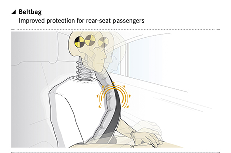 Il beltbag, prototipo sviluppato sulle misure di sicurezza ESF 2009, sarà presto disponibile, di serie, su un modello della gamma Mercedes-Benz dei segmenti superiori. Riservato ai passeggeri che occupano i sedili posteriori, in caso di impatto frontale il nastro della cintura, gonfiandosi, riduce le sollecitazioni a carico della gabbia toracica e, di conseguenza, il rischio di lesioni.Ogni qual volta i sensori di crash riconoscono un impatto frontale di notevole entità, la centralina di comando airbag attiva l’apertura ed il gonfiaggio del beltbag. A questo punto l’immissione di gas all’interno della cintura gonfia il beltbag, realizzato in più strati e dotato di giunti di strappo, triplicandone la larghezza. La maggiore superficie che si viene a creare assicura una migliore ripartizione delle sollecitazioni a carico dei passeggeri della vettura, riducendo il rischio di lesioni.