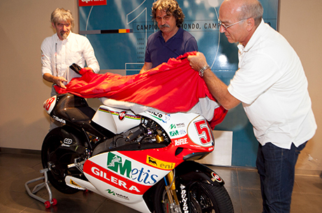 “Un altro giorno speciale, un altro gesto che riempie il cuore della nostra famiglia in memoria di una vittoria che rese Marco felice ed orgoglioso: il 20 ottobre del 2008 in sella a questa moto si realizzò il suo sogno di sempre – dichiara Paolo Simoncelli – Ricordo che sin dalle scuole elementari aveva ben chiaro in mente quale fosse il suo obiettivo: un giorno sarò campione del mondo era la frase più ricorrente sul suo diario e quel giorno, proprio in sella alla Gilera del Team Metis, il suo sogno si realizzò. Grazie ad Aprilia, ora come allora”.