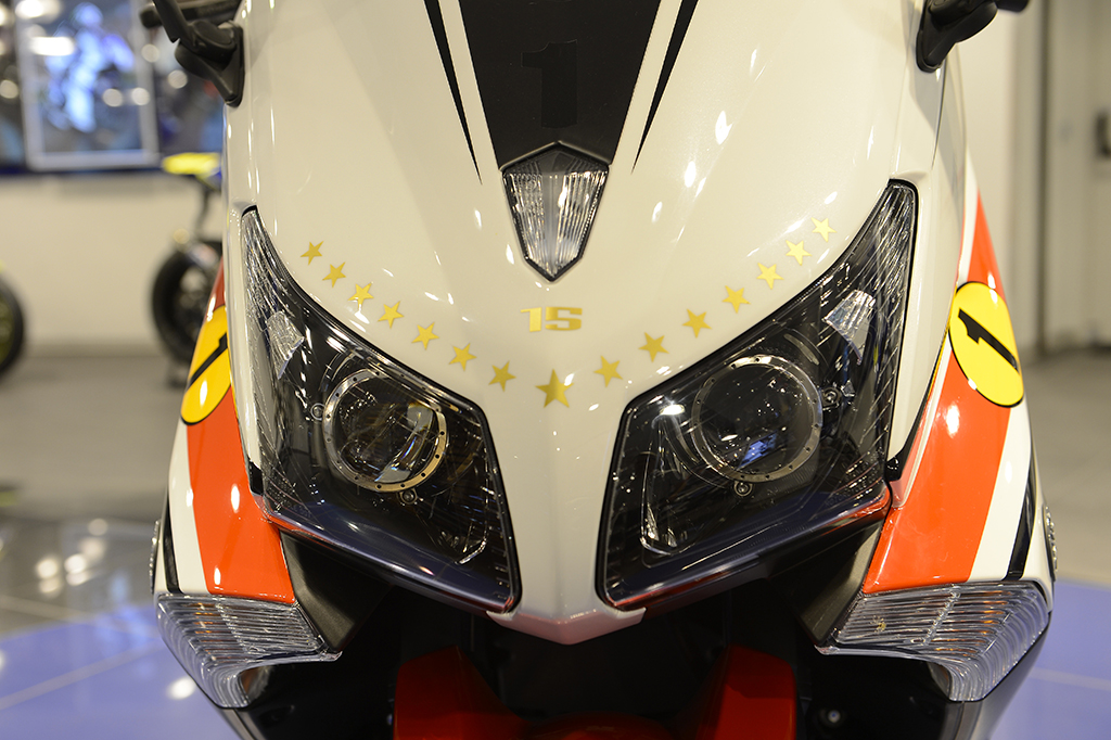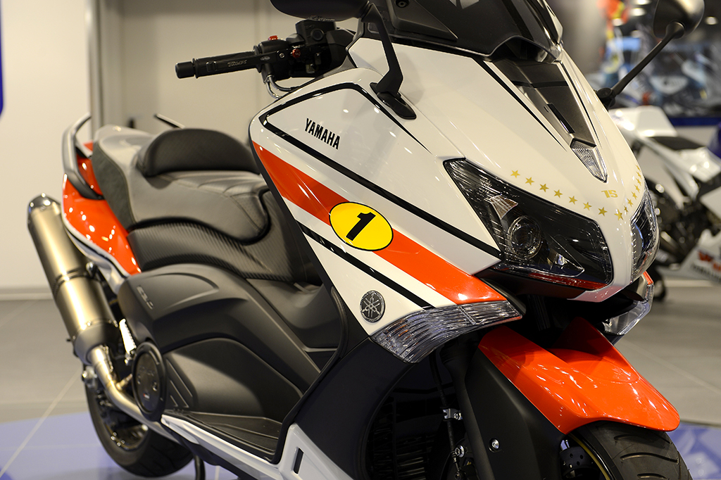 La particolare versione di Yamaha TMAX 530 dedicata al campione di Lovere è stata realizzata da Yamaha utilizzando numerose parti ed accessori speciali ed è caratterizzata da una livrea Racing ispirata proprio al celebre speedblock bianco-nero-rosso della mitica Yamaha OW23 con cui Agostini vinse nel 1975 il primo Mondiale su Yamaha nella classe 500. In particolare gli interventi effettuati su questo modello unico al mondo, il cui design concept è stato curato da Marco Ferrario del YMRE Design Center, hanno riguardato: sella in vera pelle realizzata da Claudio Conti con logo AGO ricamato su Alcantara; verniciatura realizzata da Max 77 Design; impianto di scarico Akrapovic unico esemplare serigrafia AGO; targhetta in Titanio 1/70 Ago con particolari in carbonio sviluppati da Akrapovic; leve freno e viteria in ergal prodotti da Lightech; accessori Aznom in vera pelle composti da borsa più portachiavi personalizzato (3 esemplari 1 Ago + 1 Jorge + 1 Ben); porta-targa posteriore Racing by Yamaha Accessories; telo coprimoto speciale disegnato da Yamaha Motor Racing.
