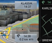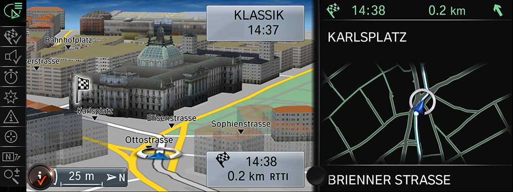 La barra delle funzioni direttamente selezionabile, che consente di cambiare rapidamente le mappe visualizzate e di accedere alle informazioni meteo e agli aggiornamenti sul traffico in tempo reale, è una delle caratteristiche progettate per garantire la massima praticità di utilizzo. Inoltre, la funzione split-screen (schermo suddiviso) consente di visualizzare le informazioni High Guiding, con la rappresentazione dettagliata degli incroci e l’indicazione precisa della direzione grazie alla funzione Lane Guiding. E ancora, la visualizzazione dei modelli delle città in 3D, che garantisce un orientamento perfetto nel traffico cittadino grazie alle realistiche immagini in prospettiva di strade e edifici, è stata ulteriormente migliorata.