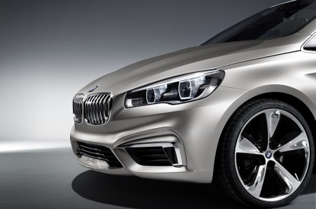 Anche nell’aspetto frontale la BMW Concept Active Tourer è caratterizzata dalla marcata espressività che identifica tutte le BMW. Lo stilema dominante è il doppio rene BMW, leggermente inclinato in avanti. Gli incisivi proiettori sdoppiati entrano abbondantemente nella sagoma laterale dei parafanghi e sono dotati delle luci di accento LED nella zona superiore (“sopracciglia”); unitamente al modulo frontale con le sue superfici ricche di sfaccettature, accentuano il look sportivo della BMW Concept Active Tourer. Le due grandi prese d’aria laterali sotto i gruppi ottici principali intensificano l’impressione di larghezza del frontale.