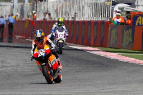 La partenza, ritardata con l’esposizione di bandiere gialle per un problema alla moto di Karel Abraham, è stata particolarmente caotica con i team che si sono schierati nuovamente per prepararsi alla nuova partenza. Quando i meccanici di Dani hanno cercato di rimuovere la termocoperta, la ruota anteriore era bloccata, provocando un ritardo per il pilota spagnolo. Il problema ai freni si è risolto oltre il tempo permesso dal regolamento, così Dani ha dovuto prendere il via dall’ultima casella della griglia. Partito ventunesimo, in poche curve Dani era già ottavo quando Hector Barbera è caduto alla curva 6, coinvolgendo anche il pilota Repsol Honda.