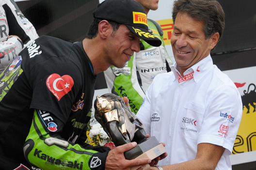 Kenan Sofuoglu, 28enne turco di Adapazari, ha conquistato in anticipo il terzo titolo Mondiale della Supersport. Nel 13esimo round vinto da Jules Cluzel (PTR Honda) al pilota della Kawasaki Lorenzini è stato sufficiente il secondo posto in volata per raggiungere quota 218 punti e diventare imprendibile per Cluzel (185 punti) nell’atto finale del 7 ottobre a Magny-Cours. Sofuoglu aveva già vinto il Mondiale delle medie cilindrate nel 2007 e nel 2010, sempre con la Honda. Primo alloro iridato per la Kawasaki Lorenzini, che ha sede a Pegognaga, nel mantovano, una zona pesantemente colpita dal terremoto dei mesi scorsi.