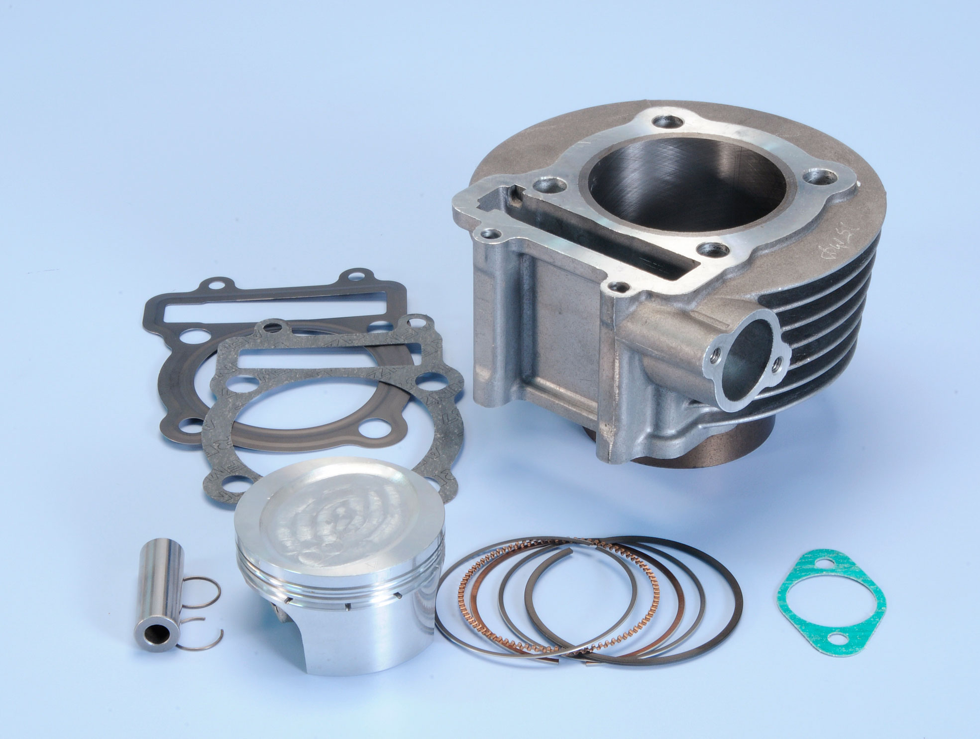 Il gruppo termico Polini fuso in lega leggera d’alluminio con alesaggio di 69 mm., incrementa la cilindrata a 221 cc. La canna in ghisa grafitica lamellare ha un ottimo coefficiente di scorrimento ed una buona stabilità termica. Il Pistone fuso per gravità in lega leggera ad alto tenore di silicio. Il disegno del cielo è specifico per ottimizzare il rapporto di compressione di 9,8:1 Tre segmenti: due in acciaio speciale nitrurato e quello superiore cromato, mentre il raschiaolio è di tipo composito.Guarnizione della testa monostrato in acciaio inox con rivestimento in tecnopolimero fluorurato per ridurre le temperature di esercizio ed aumentare la tenuta dei gas combusti alle alte temperature.