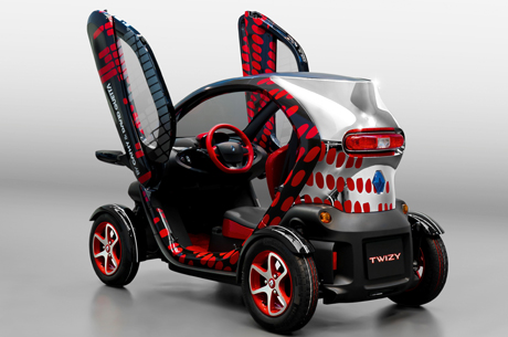 Twizy, animale notturno “Renault Twizy by Cathy e David Guetta” è una show-car che beneficia delle più recenti innovazioni che consentono di integrare LED luminosi a intensità modulabile nelle parti vetrate delle porte. Zone di cromo brillante accentuano il gioco delle luci e trasformano Twizy in un animale dal mantello luminoso. Gli interni sono stati integralmente progettati in nero e rosso, tinte scelte da Cathy Guetta. Cancellando le linee e la percezione del volume all’interno, le équipe del design Renault hanno voluto rafforzare l’idea di scatola nera del “night club”.