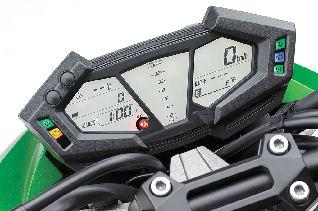 Il moderno quadro strumenti alloggia tre schermi LCD multifunzione tra i quali un contagiri grafico di tipo level-meter, a completamento del design avanzato della moto.