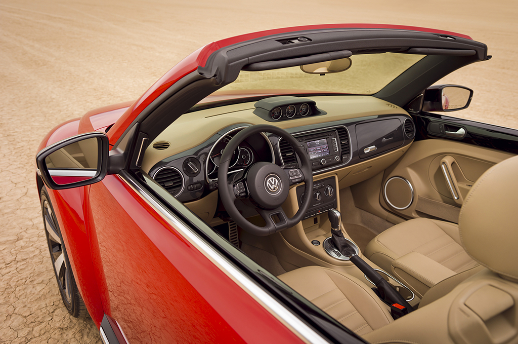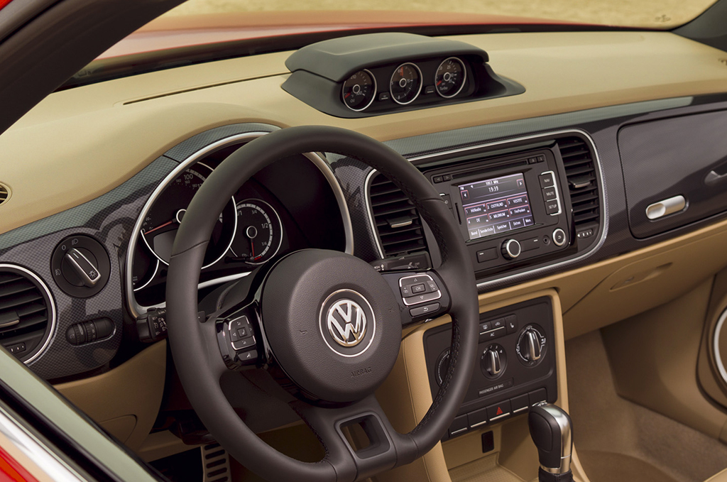 Come per le generazioni precedenti, anche l’abitacolo del nuovo Maggiolino Cabriolet si distingue per il design particolare: sulla plancia spiccano gli strumenti di forma circolare e dalle grandi dimensioni, e compaiono anche elementi classici come il cassetto portaoggetti supplementare che caratterizzava la plancia dell’originale.