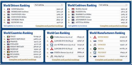 Il ranking mondiale rally della IRDA (International Rally Drivers Association) è un sistema di classificazione per piloti e co-piloti rally, stilato settimanalmente dall’IRDA per rendere possibile paragoni oggettivi tra i vari piloti e co-piloti di tutto il mondo che corrono i diversi campionati e trofei, mondiali, continentali e nazionali. La classifica, che è l’unica dedicata esclusivamente ai rally a livello mondiale, viene compilata attraverso un sistema di coefficienti assegnati ad ogni singolo rally in base alla sua importanza e validità, in base a questi coefficienti, si ottengono i punti, che vengono assegnati ai primi trenta equipaggi classificati di ogni rally disputato a calendario FIA “2012 International Sporting Calendar – Rallyes” che attualmente ha in calendario 134 rally disputati o che si disputeranno nei5 continenti del mondo. Secondo il sistema attualmente in uso, i punteggi sono calcolati sui risultati conseguiti dai piloti e dai co-piloti negli ultimi 12 mesi di gare, questo sistema è stato adottato per contrastare le critiche, secondo le quali, considerando periodi di tempo più lunghi, il ranking non avrebbe rispecchiato fedelmente l’effettivo ed attuale valore dei piloti e dei co-piloti. Al momento sono 1062 i piloti di 72 nazioni diverse, che hanno ottenuto i piazzamenti necessari ad entrare nel ranking, i primi 10 in classifica sono: