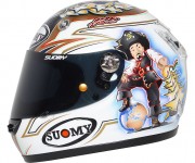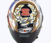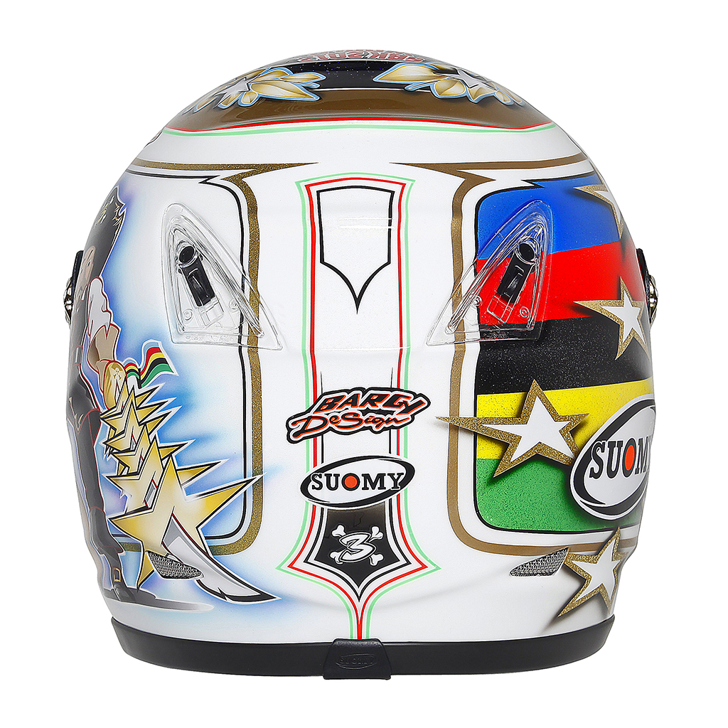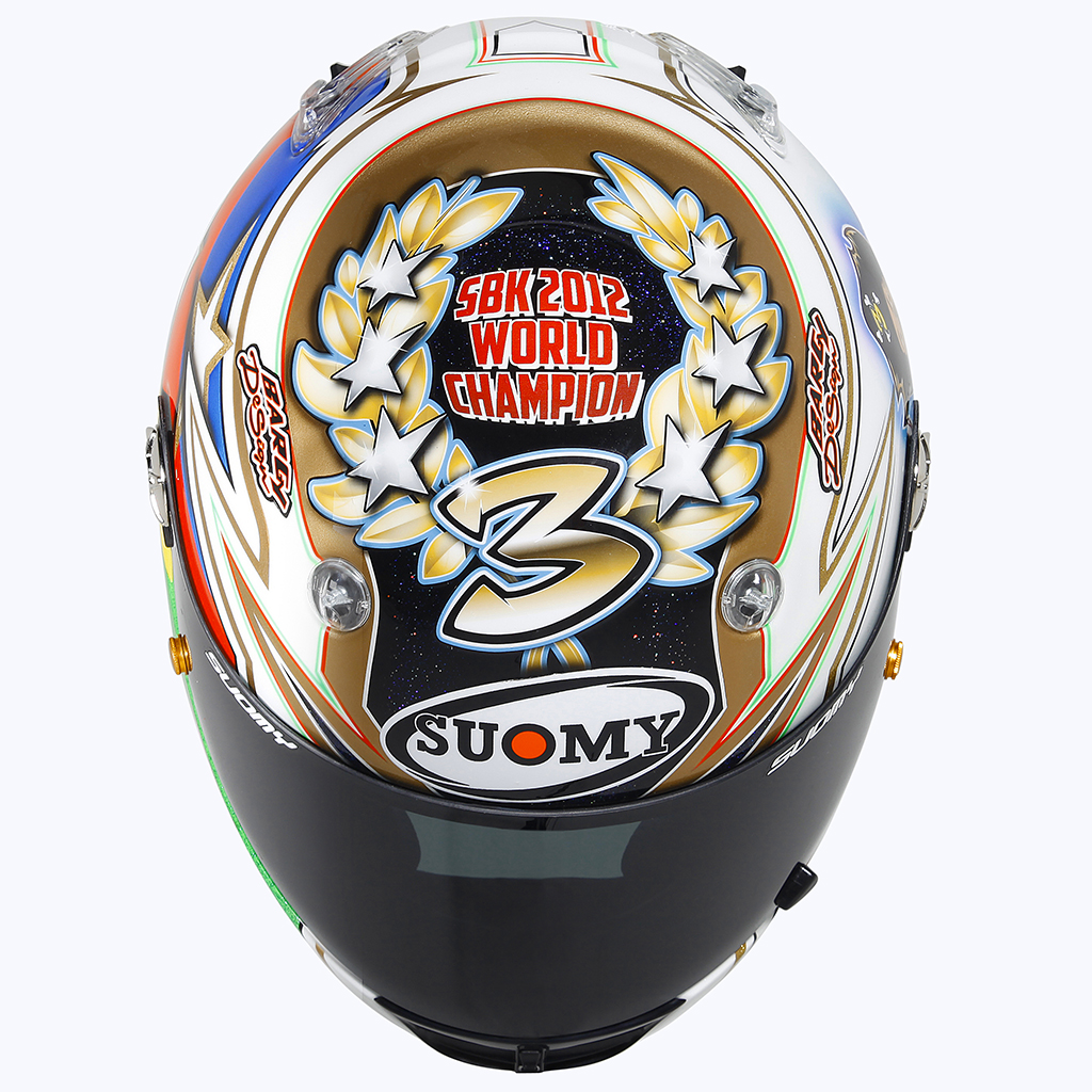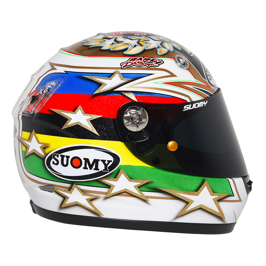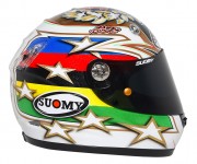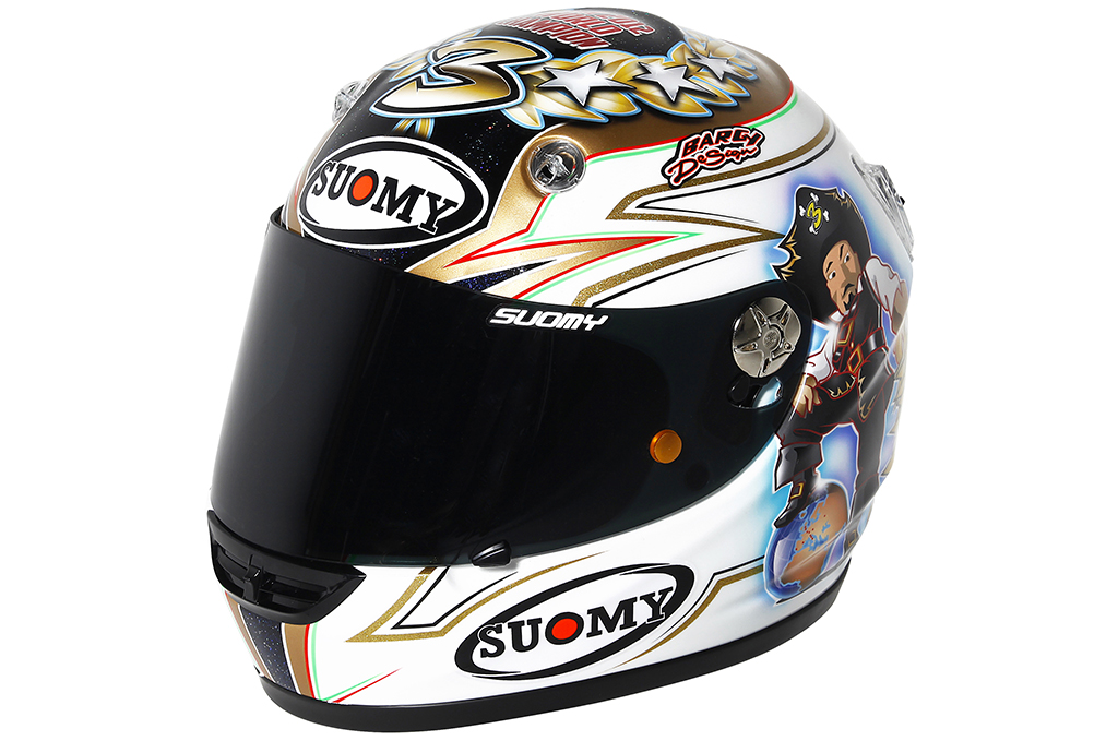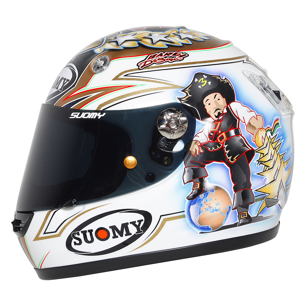 E’ oramai consuetudine di Suomy quella di avvalersi della prestigiosissima matita di Bargy, che da sempre crea i caschi di Max Biaggi, per fare una replica celebrativa per un titolo mondiale SBK. Stavolta Bargy si è superato e per la vittoria di Max ha creato un casco artistico che, oltre all’iride, ritrae il pirata con infilzate sulla sua spada le 6 stelle dei 6 titoli mondiali vinti. Suomy produrrà questo oggetto super funzionale e sicuramente da collezione in un numero limitato di 1000 esemplari, ognuno numerato da 0001 a 1000. Un oggetto cool per i fan di Biaggi, per i fan della SBK e per tutti coloro che affidano consapevolmente la loro sicurezza ai prodotti Suomy.