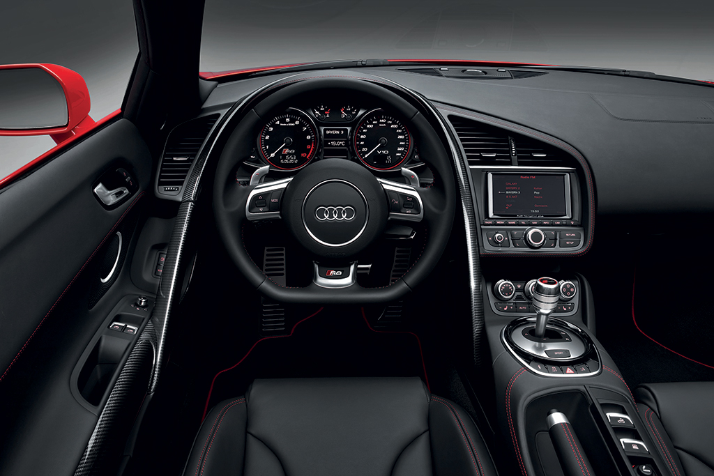 Nella R8 Spyder e nella R8 V10 plus molti elementi applicati alla carrozzeria sono in plastica rinforzata con fibre di carbonio (CFRP). Anche all’interno del modello di punta ritroviamo lo stesso materiale; i sedili di guidatore e passeggero sono avvolgenti e hanno schienale ribaltabile. L’abitacolo di questa sportiva ad alte prestazioni è stato ulteriormente affinato in tutte le versioni. Gli equipaggiamenti in pelle Nappa con impunture a losanghe comprendono rivestimenti dei sedili e inserti nei pannelli delle portiere dotati di impunture. Queste impunture sono disponibili a richiesta anche per il cielo in Alcantara.