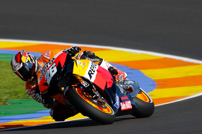 Dani Pedrosa non lascia dubbi nelle qualifiche del Gran Premio Generali de la Comunitat Valenciana e ad un minuto dal termine della sessione sorprende tutti battendo il record di Valentino Rossi (2006) di 1’31.002 per 158 millesimi. Lo spagnolo è l’unico di sempre a correre sotto la barriera dell’1’31 e domani, nella gara finale della stagione, partirà dalla pole position, la quinta del 2012.