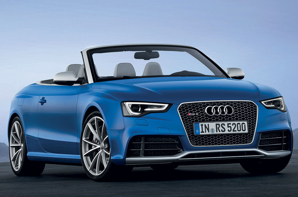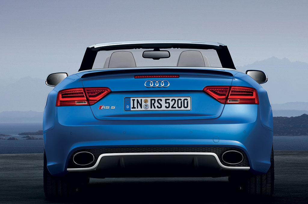 Audi RS 5 Cabriolet: dinamismo “en plein air”. La quattro posti realizzata dalla quattro GmbH a Neckarsulm affascina per l’eccezionale combinazione di eleganza e potenza. Il suo motore 4.2 FSI, un V8 aspirato ad alti regimi di rotazione da 450 CV (331 kW), accelera la vettura da 0 a 100 km/h in 4,9 secondi. Sono stati inoltre introdotti sofisticati accorgimenti per trasmissione e autotelaio.