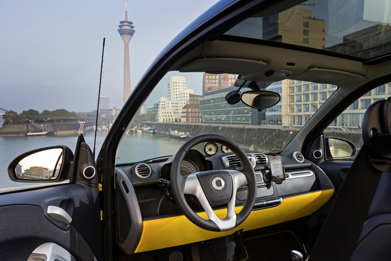 Il volante sportivo in pelle a tre razze con comandi del cambio integrati e cuciture a contrasto yellow, ed i tappetini realizzati appositamente per il modello speciale, con scritta «cityflame» ricamata arricchiscono l’esclusivo equipaggiamento di questa serie speciale rinominata smart cityflame edition.