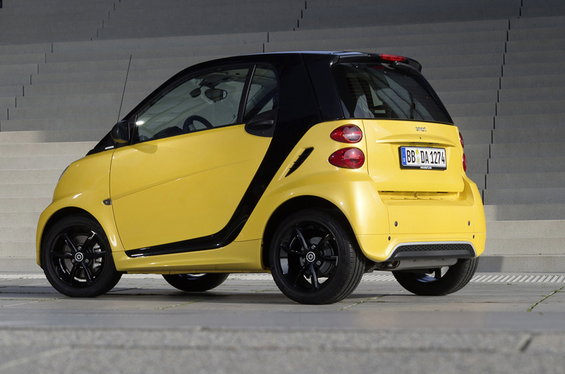 Combinata alla cellula di sicurezza tridion in black, agli esclusivi cerchi in lega a tre doppie razze verniciati in black con pneumatici maggiorati (175/55 R 15 anteriori e 195/50 R 15 posteriori) e agli alloggiamenti dei retrovisori esterni, anch’essi in black, la verniciatura yellow produce un look particolarmente sportivo ed aggressivo sulla smart cityflame edition.