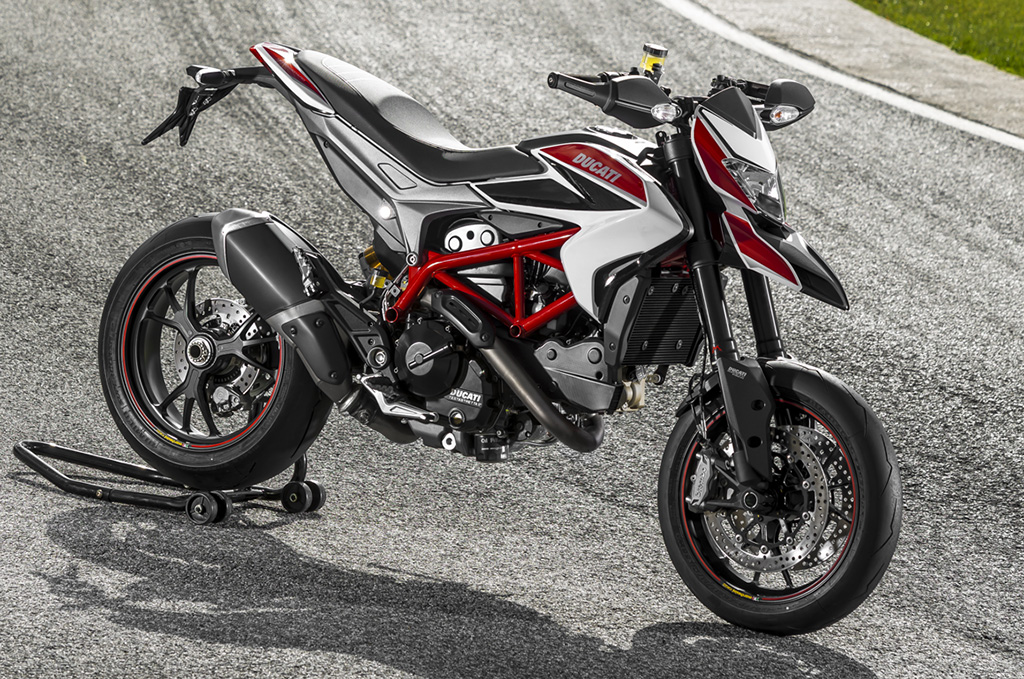 La Ducati Hypermotard SP viene prodotta nella livrea Ducati Corse rossa, bianca e nera, con elementi in grigio e telaio a Traliccio rosso. I cerchi Marchesini sono finiti in nero e sfoggiano il caratteristico bordino perimetrale rosso.