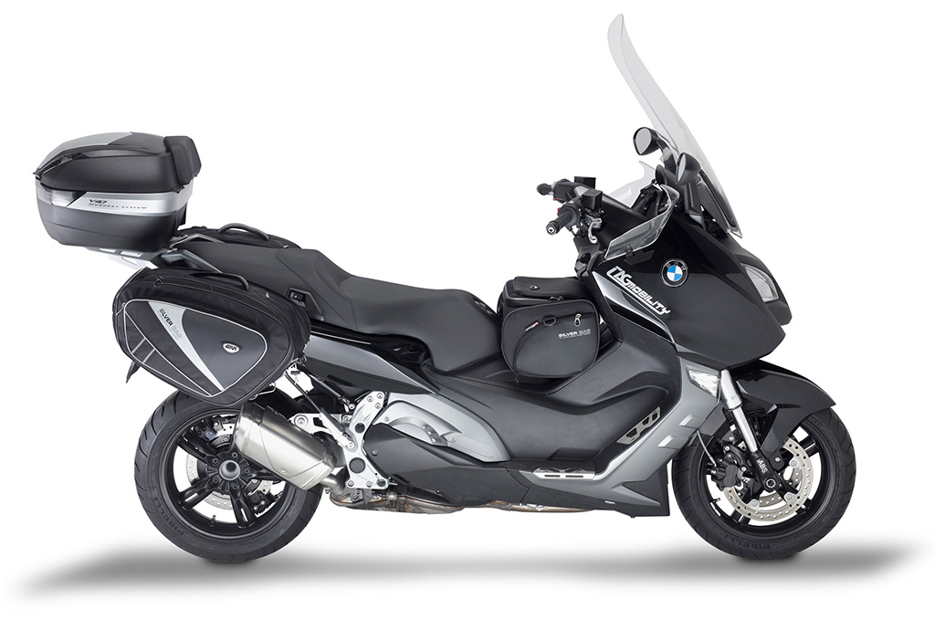 Per il modello C 600 Sport, GIVI mette in campo tre supporti per top case: uno per bauletti MONOLOCK (SR5105M, 86 euro) e due per i MONOKEY, di cui uno realizzato in alluminio anodizzato e perfetto anche come semplice portapacchi (rispettivamente SR5105 e SRA5105, 144 euro). Il top case che si vede in foto è il capiente V47NT dotato di schienalino E134 (215 + 24,50 euro). Sempre sul modello Sport GIVI propone il montaggio di telaietti specifici laterali (TE5105, prezzo 82 euro) per borse semirigide Easylock (quelle dotate di attacco rapido) oppure decidere per una coppia di borse morbide (in foto le SV201, 122,50 euro).