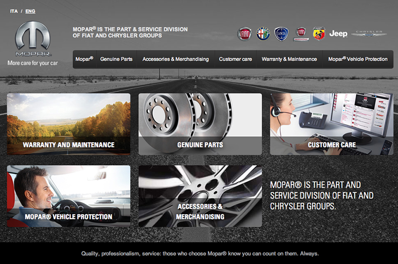 Il progetto web è disponibile in due complementari livelli di esperienza: nel primo, la piattaforma www.mopar.euoffre una dimensione social e informativa che dà la possibilità all’utente di scoprire il mondo MOPAR a 360° e di interagire con le funzionalità di “social networking” offerte da Facebook e Twitter. Il secondo livello presenta invece una navigazione “personalizzata” per gli utenti registrati, per ricevere offerte dedicate, acquistare online tutti gli accessori disponibili, partecipare a eventi e soprattutto per conoscere meglio la propria vettura. Grazie ai servizi personalizzati, il sito www.mopar.eu assume le caratteristiche di un “owner centre”.