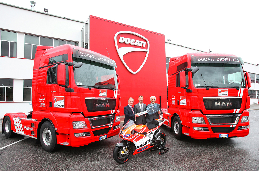 Sette trattori MAN TGX 18.480 sono stati consegnati a Borgo Panigale alla presenza di Gabriele Del Torchio, Amministratore Delegato di Ducati Motor Holding Spa – Giancarlo Codazzi, Amministratore Delegato di MAN Truck & Bus Italia Spa – Paolo Ciabatti, Direttore Progetto MotoGP Ducati Corse e del pilota Andrea Dovizioso.La fornitura andrà a costituire la “forza motrice” del Ducati Team in MotoGP e garantirà il trasporto dei semirimorchi, sia della squadra corse (quindi moto, officina e ricambi) sia delle hospitality, su tutti i circuiti della stagione europea.