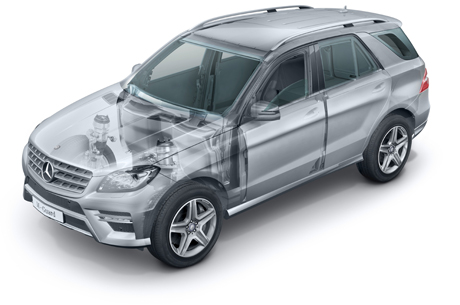 Fulcro della nuova Classe M Guard, come di tutte le vetture blindate Mercedes-Benz, è rappresentato da un principio di sviluppo globale: la protezione speciale integrata, ovvero singoli elementi di protezione completamente integrati nella carrozzeria grezza attraverso un processo indipendente. L’intero abitacolo viene dotato di una sorta di armatura comprendente, tra gli altri, montanti del tetto, serrature e fessure delle porte o dispositivi di fissaggio degli specchi retrovisori esterni. Così, con la qualità tipica Mercedes-Benz, viene creato un sistema di protezione completo contro attacchi balistici anche nei punti dove un montaggio a posteriori sarebbe impossibile o causerebbe una riduzione del livello di protezione offerta dall’intera struttura.