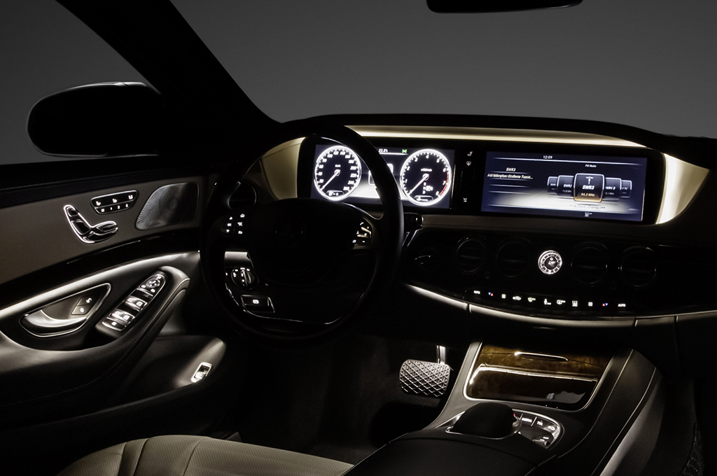 Due display a colori ad alta risoluzione in formato 8:3 e con una diagonale di 30,7 cm (12,3″) compongono la nuova centrale informativa della Classe S. Quello sul lato sinistro assolve la funzione precedentemente affidata alla strumentazione e fornisce al guidatore tutte le principali informazioni. Il display sul lato destro permette invece di utilizzare comodamente le funzioni Infotainment e Comfort. La nuova configurazione di display e comandi pone in primo piano aspetti quali ergonomia, comfort di comando e sicurezza.