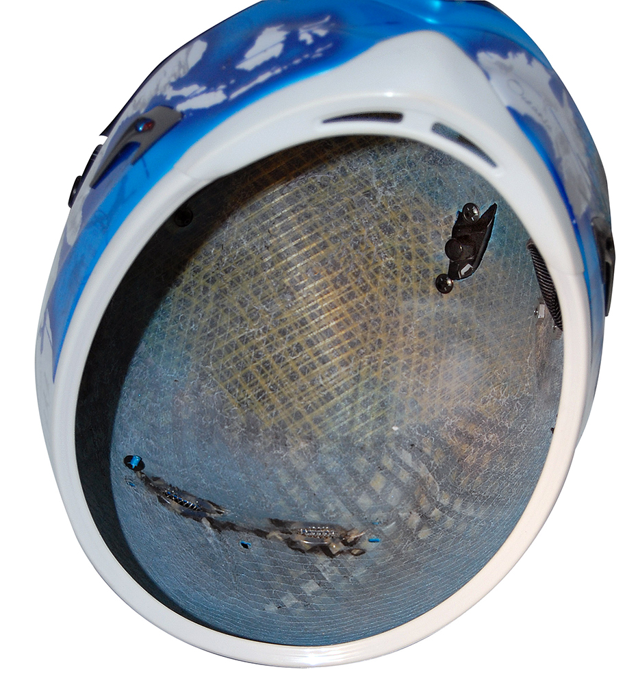 Dalle immagini si può notare come entrambe le calotte abbiano interagito nel migliore dei modi per assorbire l’urto causato dall’impatto con l’asfalto. La calotta esterna mostra infatti una delaminazione delle fibre che la compongono, con rotture limitate agli strati superficiali esterni; la calotta interna mostra invece una deformazione del polistirolo proprio in corrispondenza del punto di impatto.