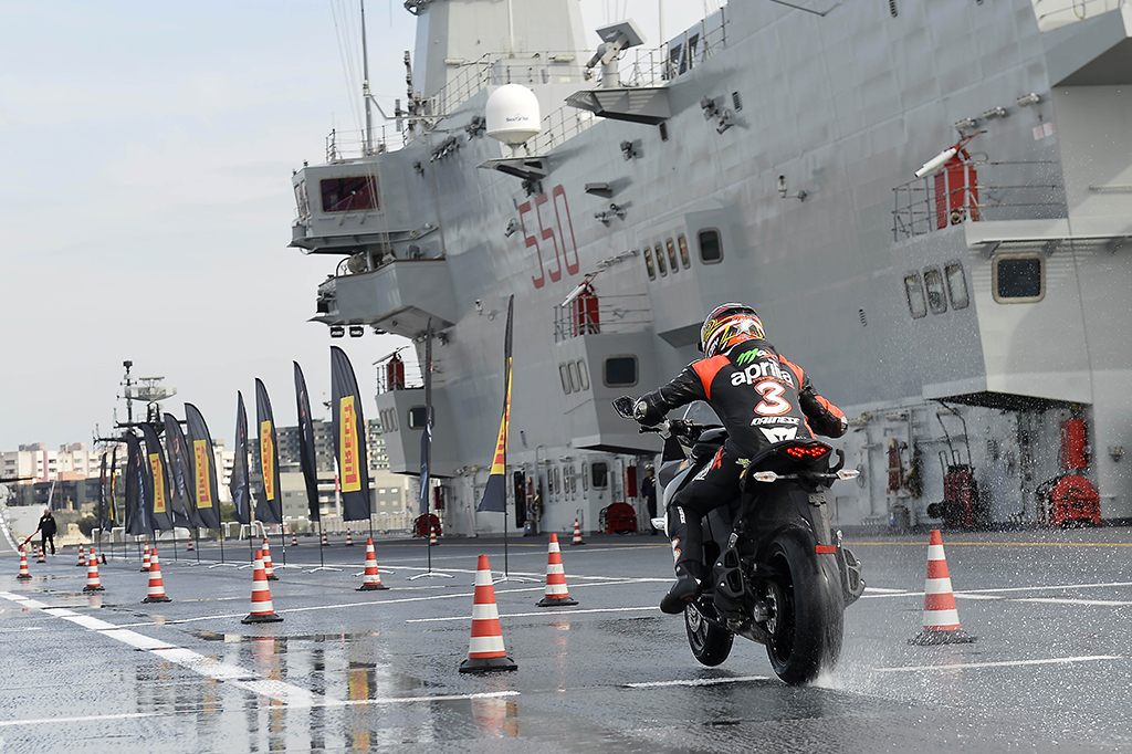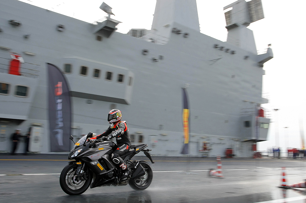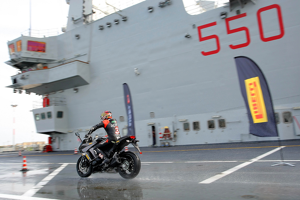 Il pluricampione mondiale Max Biaggi tester d’eccezione Pirelli in una prova di frenata sul bagnato senza precedenti: inchiodare una moto lanciata sul ponte di volo di una portaerei militare, con asfalto irrorato da pompe d’acqua a 17 atmosfere.