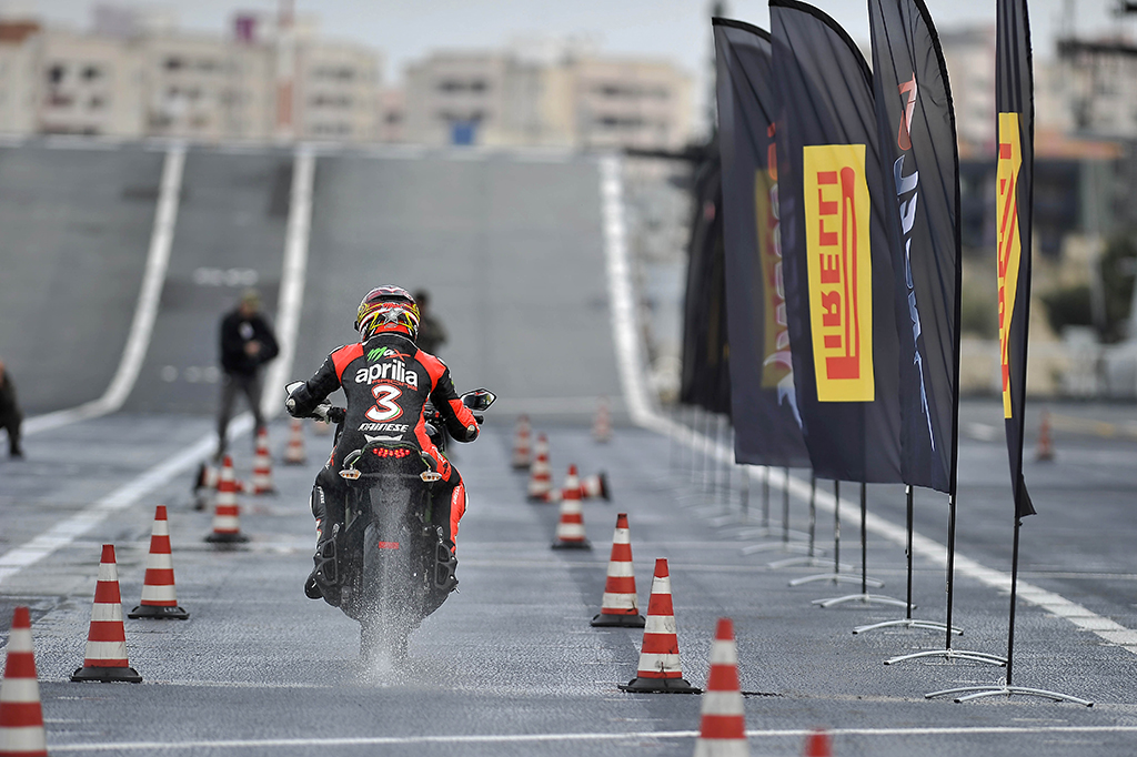 Il sei volte Campione del Mondo e attuale Campione in carica del Campionato Mondiale Superbike ha accelerato fino a 100 km/h per poi pinzare forte sui freni nel punto di frenata prestabilito. I nuovi Angel GT hanno consentito a Biaggi prima di scaricare a terra tutti i cavalli della sua motocicletta e poi di garantirgli l’arresto immediato sull’asfalto bagnato.