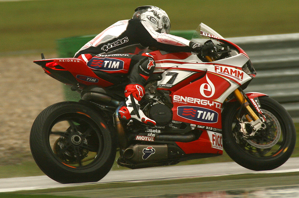 Assen (Paesi Bassi), venerdi’ 26 aprile 2013: una prima giornata bagnata per il Team SBK Ducati Alstare quella odierna sul circuito TT di Assen. Sesta posizione per Ayrton Badovini e nona per Carlos Checa nelle prime qualifiche disputate sul tracciato olandese.I piloti Carlos Checa ed Ayrton Badovini sono scesi oggi su di una pista bagnata per le prime prove libere di questa stamattina. La pioggia ha disturbato tutta la sessione, ma nonostante le condizioni meteo i portacolori del team Ducati Alstare hanno potuto completare una serie di giri con dei tempi interessanti. Ayrton in particolare si è migliorato verso la fine della sessione, facendo registrare un 2’02.5 negli ultimi minuti che gli è valso la settima posizione alla fine della sessione, mentre Carlos, grazie ad un tempo veloce in 2’05.8, ha chiuso nono.