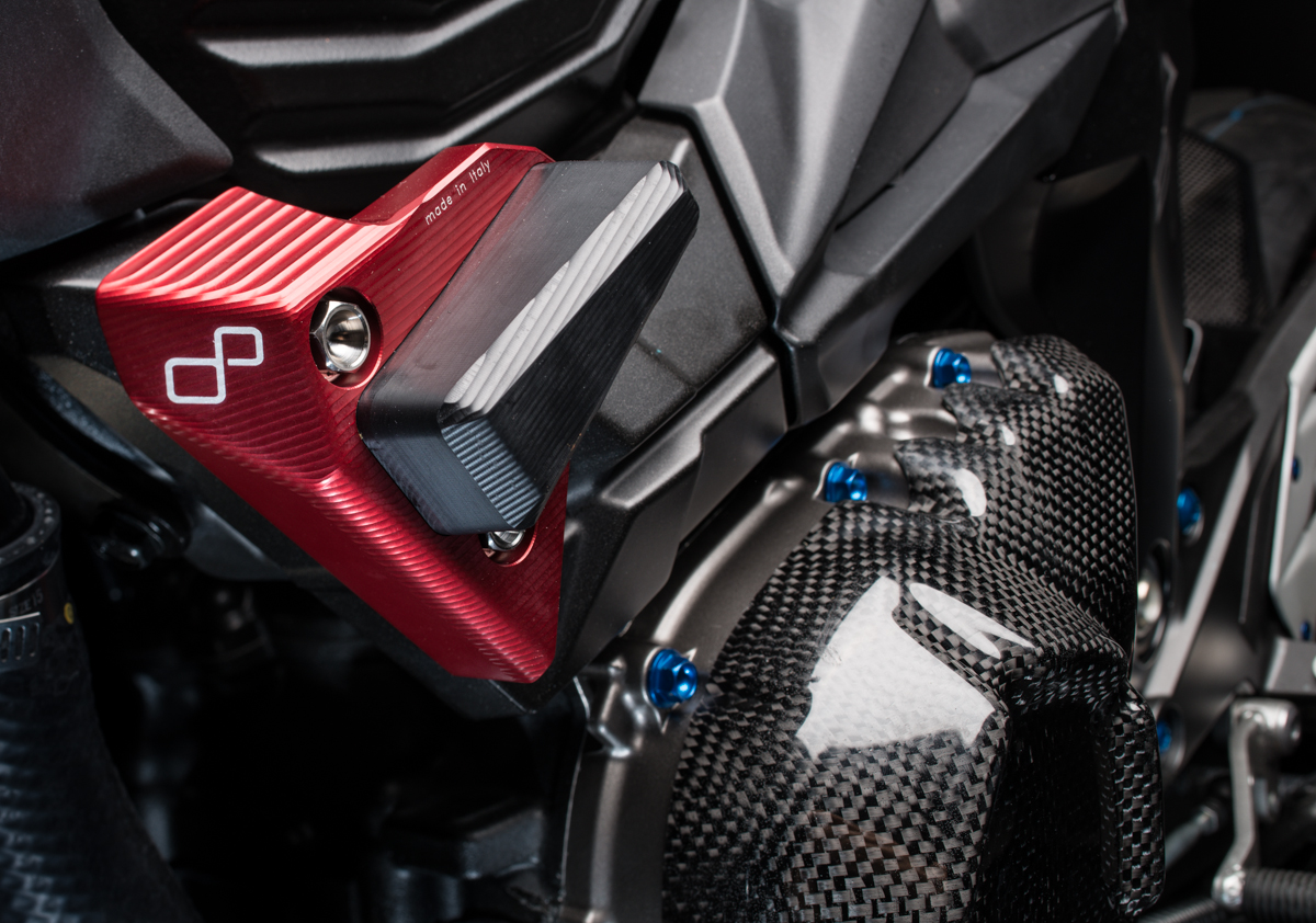 Fiore all’occhiello del momento sono le esclusive protezioni telaio di nuova concezione: la solida base è in ergal, viene interamente ricavata dal pieno, ed è progettata per offrire la più ampia superficie possibile di attacco al telaio, in modo da dissipare al massimo l’entità dell’eventuale impatto.