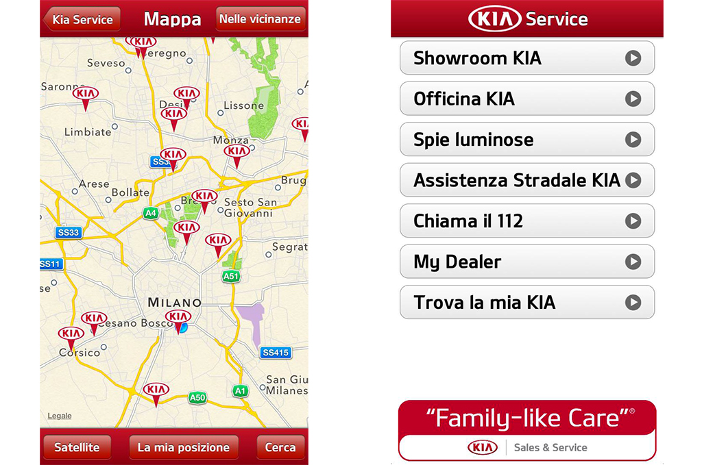 Un servizio esclusivo offerto da Kia Motors Company Italy per garantire assistenza ovunque ci si trovi: la nuova App “Kia Service” per iPhone, iPad, smartphone e tablet Android permette di rintracciare in Italia e in diverse parti d’Europa la concessionaria, lo showroom oppure l’officina Kia più vicina, in qualsiasi momento. Basterà, infatti, scaricare l’applicazione gratuita dall’App Store di iOs o dal Google Play Store e con pochi semplici click potrete chiamare direttamente il concessionario, contattarlo via email, ottenere le indicazioni stradali necessarie a raggiungerlo, oppure, in caso di necessità, ricevere assistenza stradale.