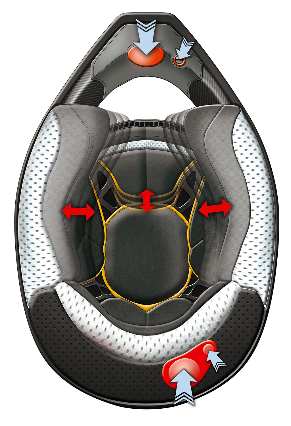 La calotta interna in EPS è a doppia densità. Il cinturino sottogola è a Doppio “D” con linguetta di sgancio rapido. La gommapiuma interna a tripla densità aumenta il comfort generale mentre l’ottimizzazione della ripartizione delle masse garantisce una calzata perfettamente equilibrata ed un peso “percepito” addirittura inferiore a quello reale.