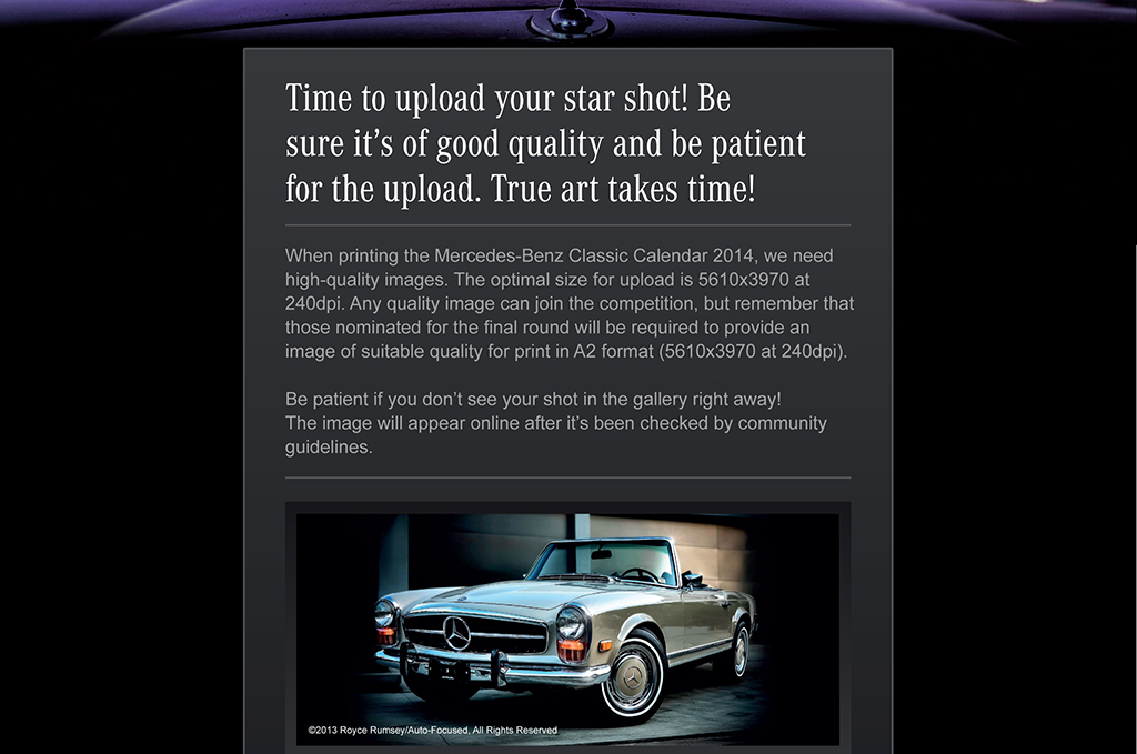 Per proprietari ed appassionati di Mercedes-Benz classiche partecipare al concorso è molto semplice: bastano macchina fotografica ed iscrizione a Facebook. Le foto delle classiche o delle youngtimers (vetture costruite in anni precedenti al 1994) dal 14 giungo al 23 luglio 2013 potranno essere caricate mediante un’apposita App sulla pagina Facebook del Museo Mercedes-Benz (http://www.facebook.com/mercedesbenzmuseum). La community Facebook valuterà le opere pervenute in una prima fase di qualificazione. La selezione finale avrà luogo a fine luglio 2013, quando una giuria scelta individuerà i dodici scatti più interessanti per il Calendario Mercedes-Benz Classic 2014 esaminando una rosa di 100 fotografie. Tra i membri della giuria anche il fotografo statunitense Royce Rumsey, vera icona della fotografia di auto d’epoca. Insieme a lui anche Jurymitglied Teymur Madjderey, fotografo e blogger di Colonia che con passione cattura i momenti più entusiasmanti delle manifestazioni dedicate alle classiche, come la Mille Miglia. Oltre a vedere la loro foto inserita nel Calendario Mercedes-Benz Classic 2014, i vincitori riceveranno anche un premio in denaro di 1.000 Euro ciascuno.
