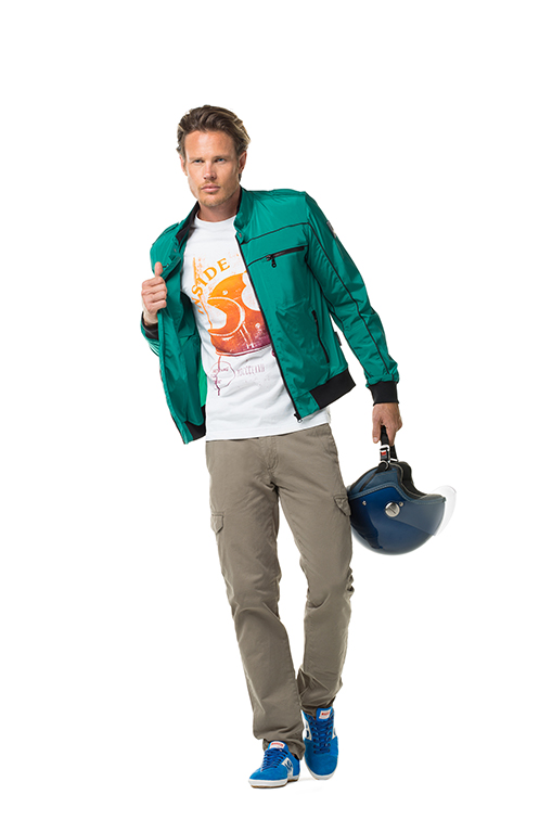 La nuova MOTOCROSS Jacket (foto), un giubbotto vintage rieditato in nylon stretch con bande sportive che segnano il perimetro e che lo rendono più active. Presentato in emerald green e royal blu, colori tipici del racing.