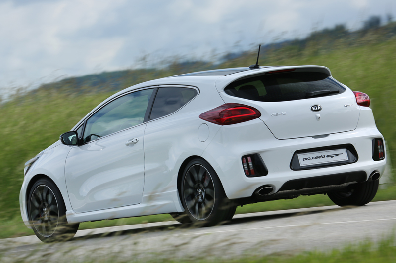 Fianco a fianco sulle linee di Zilina Le GT escono dallo stesso impianto di produzione di Zilina (in Slovacchia) nel quale vengono realizzate, fra le altre, tutte le versioni della gamma cee’d. In comune con le altre versioni cee’d, la GT conserva le misure di lunghezza (4310 mm), larghezza (1780 mm) e passo (2650 mm). Nel caso delle pro_cee’d GT, la linea del tetto è più bassa (1430 mm) e il montante B è arretrato; cambiano quindi i pannelli della fiancata, i vetri laterali, il portellone, le luci posteriori e lo scudo paraurti.