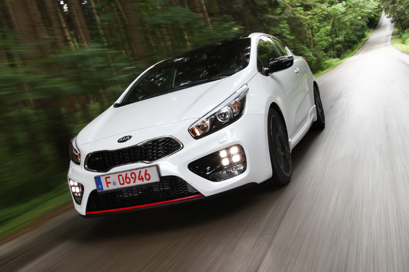 Comportamento esaltante in pista e su strada Il gruppo propulsore e la piattaforma delle GT sono stati sviluppati in Europa e messi a punto con prove dinamiche su strada e in circuito. Il programma di test ha comportato la percorrenza di 160.000 km sulle autostrade tedesche ad alta velocità (a una media totale, superiore ai 150 km/h) e 480 giri del celebre tracciato di 21 km della Nordschleife al Nürburgring. Tutto questo ha portato a una messa a punto delle sospensioni capace di abbinare le alte prestazioni espresse dal nuovo motore con eccezionali caratteristiche dinamiche, senza perdere le doti di confort e affidabilità proprie del modello cee’d e pro_cee’d da cui derivano. Il risultato finale è quindi una eccezionale agilità ed efficacia di comportamento nella guida sportiva ma anche un’esperienza di guida completa e appagante da vera Gran Turismo. Per entrambi i modelli gli ammortizzatori anteriori sono stati irrigiditi del 10% in compressione e del 30% in distensione, quelli posteriori del 200% in compressione e del 50% in distensione. Anche le molle sono state irrigidite sia all’avantreno che al retrotreno; la barra antirollio è stata maggiorata, con un diametro di 19 mm invece di 18 mm, e all’avantreno sono stati adottati boccole elastiche più rigide. Tali accorgimenti hanno ridotto il sottosterzo e la tendenza al rollio, a vantaggio della maneggevolezza e della prontezza di guida.