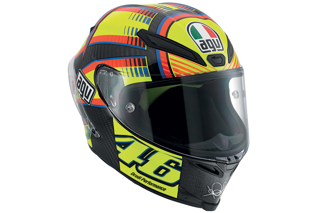 Quest’ultima grafica, disegnata come di consueto dal designer Aldo Drudi, rappresenta lunghi raggi di sole in posizione frontale di colore giallo – colore preferito da Valentino perché simboleggia l’energia – che si intrecciano sul retro con la luna dal colore blu elettrico; un incrocio simile al carattere di Valentino, un po’ solare e lunatico. Tra le zone cromatiche spicca la trama in carbonio, materiale che conferisce un peso ultraleggero, come si addice ad un casco pensato per un uso sportivo e da pista, come è il Pista GP.