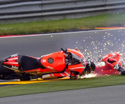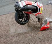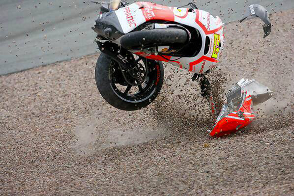 Andrea Dovizioso in sella alla Ducati Desmosedici GP13 Evoluzione ed Andrea Iannone in sella alla “tradizionale” GP, sono autori di due cadute che per fortuna nella spettacolarità non hanno avuto conseguenze sui piloti.