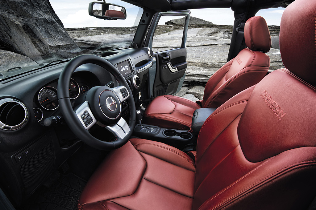 Gli interni presentano esclusivi sedili in pelle rossa con la scritta “Rubicon 10th Anniversary” ricamata sullo schienale dei sedili anteriori riscaldabili. Il volante rivestito in pelle, le portiere e il bracciolo centrale sfoggiano impunture dello stesso colore dei sedili. La maniglia di sostegno lato passeggero è caratterizzata dallo scritta “Rubicon 10th Anniversary”. Inserti Silver impreziosiscono le bocchette di ventilazione, le razze del volante e le maniglie di apertura delle portiere. L’esclusiva strumentazione “10th Anniversary” di questa versione speciale comprende il computer di bordo (EVIC – Electronic Vehicle Information Center) e consente di visualizzare le informazioni relative alla pressione degli pneumatici, alla temperatura e alla pressione dell’olio.