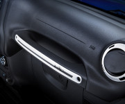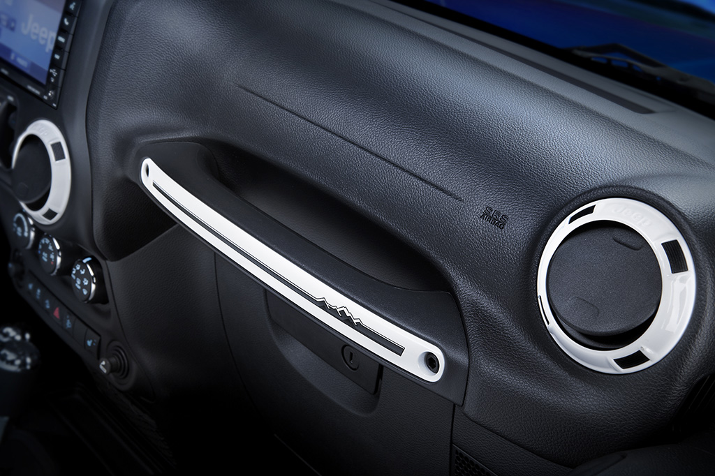 Completano l’allestimento esterno, la decalcomania con il profilo a tre colori delle montagne, applicata lateralmente sul cofano e lo sportello carburante nero firmato Mopar