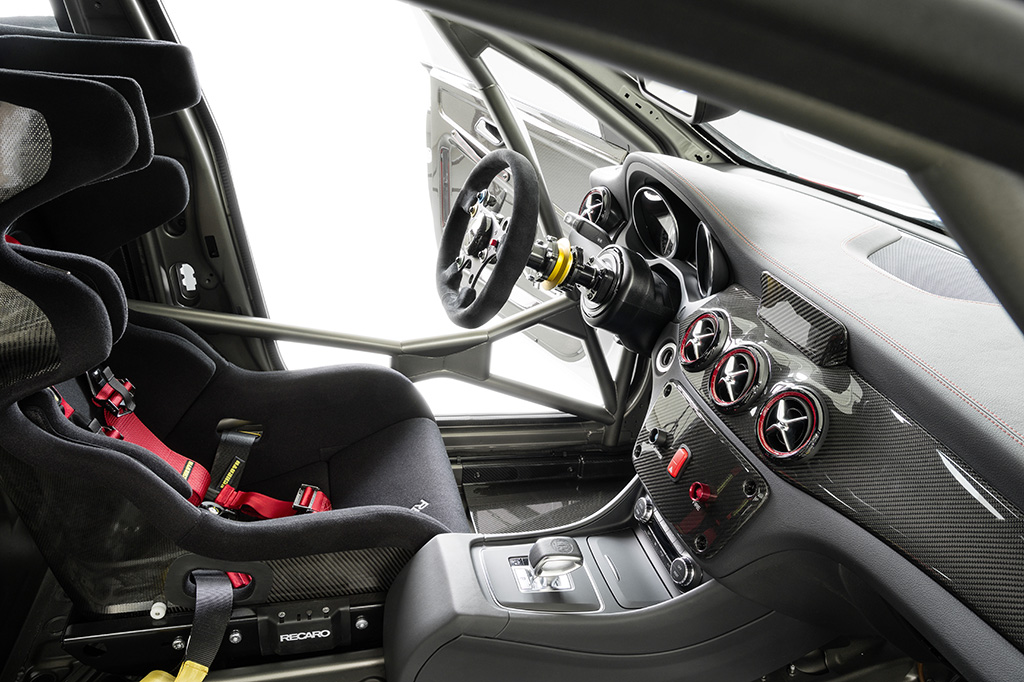 Gli interni sono caratterizzati dalla tipica atmosfera funzionale delle auto da corsa: il roll-bar è realizzato in acciaio ad alta resistenza. L’elevato livello di sicurezza è assicurato dal sedile a guscio da competizione Recaro P 1300 GT in carbonio ,con predisposizione per il sistema HANS (Head and Neck Support), e dall’impianto antincendio integrato. La strumentazione AMG inserita nella plancia fornisce informazioni in merito alla velocità, al regime del motore nonché alla temperatura d’esercizio di motore e cambio. Il volante da competizione con bilancieri per l’inserimento delle marce assicura il perfetto controllo della vettura. Sulla console centrale sono stati inseriti ulteriori comandi come l’interruttore centrale per l’elettronica di bordo nonché gli interruttori per le luci di emergenza e l’impianto antincendio.