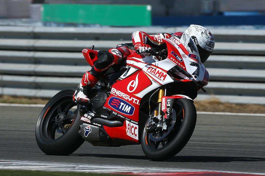 Istanbul (Turchia), venerdi’ 13 settembre 2013: la fortuna non e’ stata dalla parte del team SBK Ducati Alstare oggi al circuito Intercity Istanbul Park in Turchia. Partecipando alle prime prove di questo dodicesimo round del Mondiale Superbike, sia Carlos Checa che Ayrton Badovini sono stati vittime di cadute e sfortunatamente entrambi si sono fatti male.Le prime prove della mattinata si sono svolte con temperature calde (aria 30˚C, asfalto 44˚C). E’ stata una sessione di 90 minuti, piu’ lunga del solito, per dare ai piloti la possibilita’ di imparare bene questo nuovo tracciato. Carlos, dopo qualche problema nella prima fase, ha migliorato molto i suoi tempi nella seconda parte del turno per avvicinarsi ai leader. Subito dopo aver fatto segnare il suo giro piu’ veloce della sessione (59.2), lo spagnolo e’ stato vittima di un brutto highside alla seconda curva. E’ stato portato in Clinica Mobile dove i medici hanno rilevato una contusione al torace, ed una possibile frattura dello scafoide del polso sinistro. Purtroppo per il pilota spagnolo non sara’ possibile continuare il weekend e si dovra’ valutare dopo ulteriori esami quando potra’ tornare in pista.
